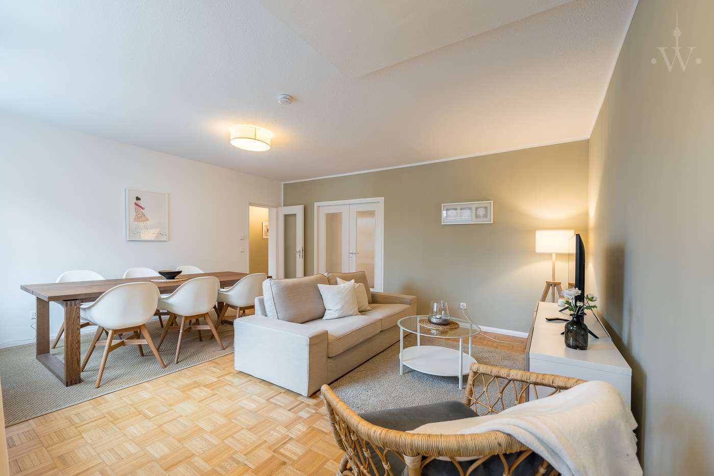 Mit einem großzügigen, lichtdurchfluteten Wohnzimmer mit Essbereich bietet das Apartment genug Raum für Erholung nach einem langen Arbeitstag. Zusätzlich verfügt die Wohnung über ein gemütliches Schlafzimmer, eine hochwertige Küche und ein modernes Wannenbad.