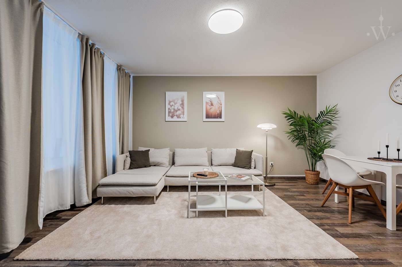 Der großzügige Wohnbereich ist modern eingerichtet und bietet ein gemütliches Sofa, einen TV, einen integrierten Arbeitsbereich sowie einen Essplatz. Große Fenster sorgen für viel Tageslicht und schaffen eine helle, freundliche Atmosphäre.