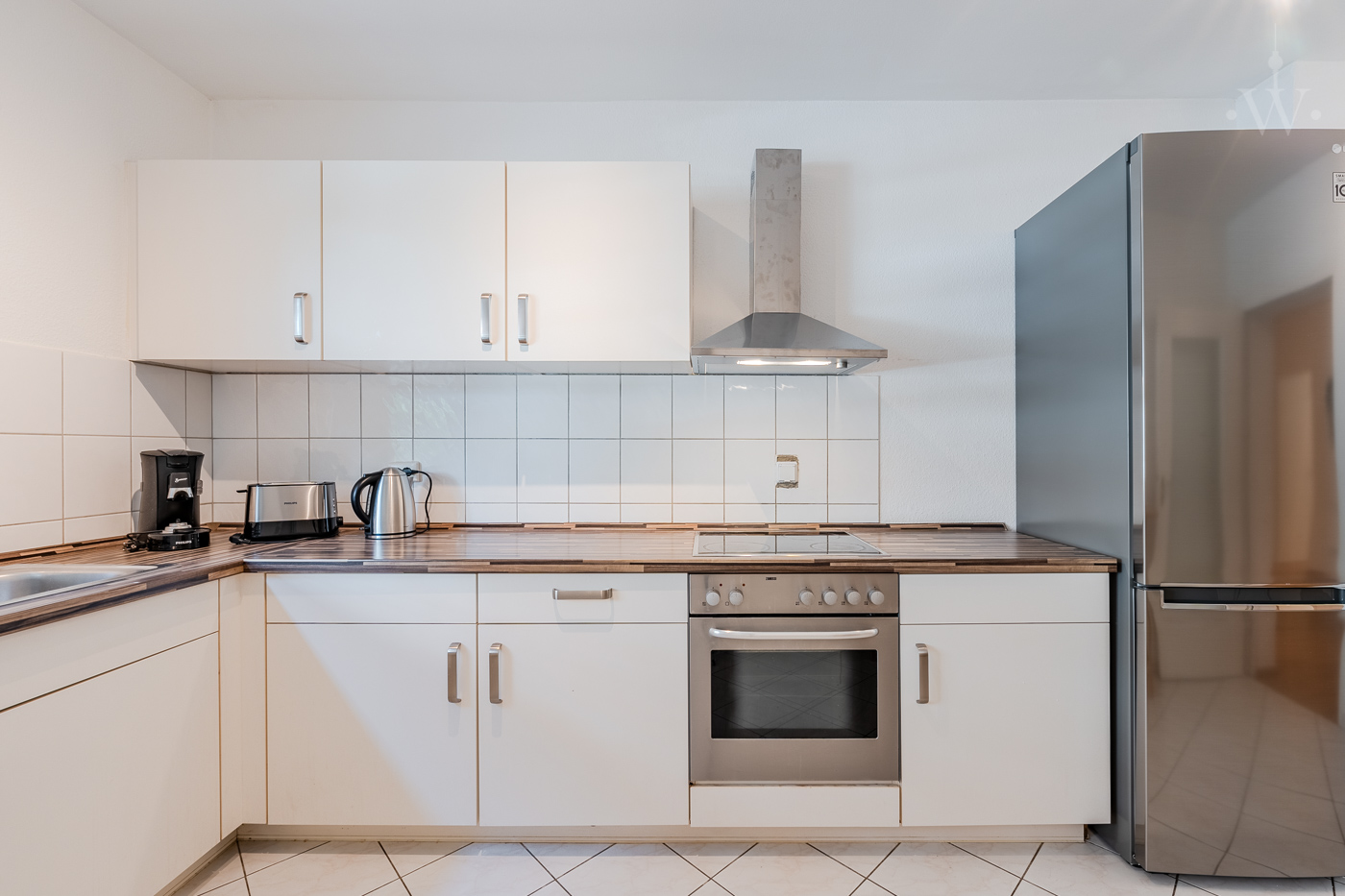 This flat has been completely renovated and has a large living room, 4 bedrooms with cosy box-spring beds, a utility room, a bathroom with bathtub and shower, a guest WC and a modern kitchen. All rooms are also equipped with a wardrobe and desk. The centrepiece of the flat is the large living room with adjoining balcony, dining area, reading corner and sofa area - here you can relax with colleagues/friends after work.